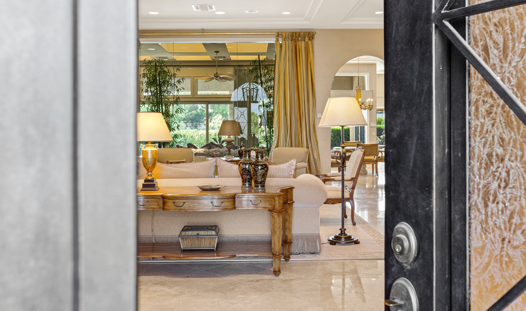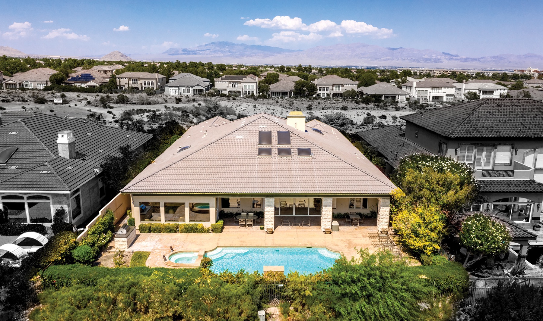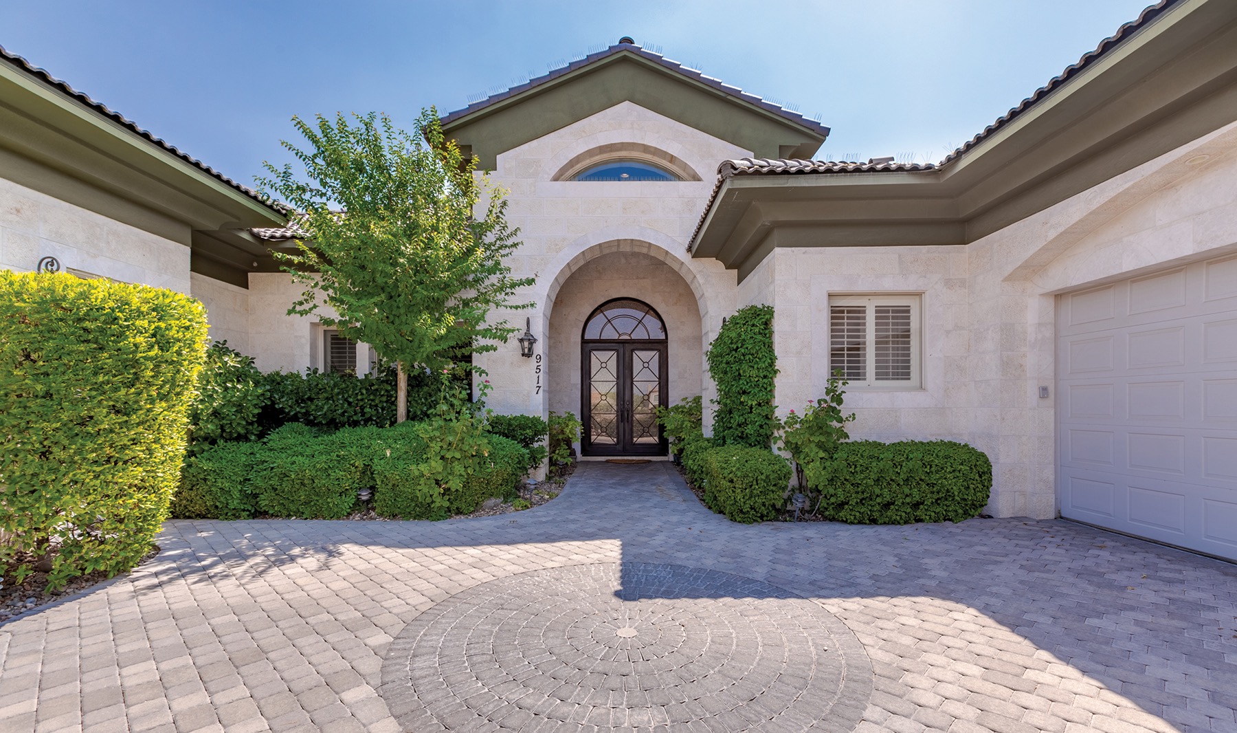 Traditional keystones accentuate the height and shape of the repeating arches that characterize the stunning interiors of this traditional home in Queensridge. Most of the rooms have expansive views through large windows, and the indoor-outdoor ambiance of the home is evident from every vantage point. Even the outdoor spa and patio design echo the arched motif, and many of the home's high half-moon windows contribute additional dramatic flair, as do curving kitchen counters, round door medallions, and other architectural features. With nearly 4,700 square feet of livable space, this family residence features oversize rooms, including a master suite sitting room and an adjacent alcove with its own coffee, juice, or wine bar. Huge dual closets and separate bath areas accommodate all owners' needs, and the bedroom suite opens to the home's garden room that leads to the backyard pool and entertainment area. The home features multiple areas for both formal and casual gatherings, a dedicated home office/library with paneling and built-in bookshelves, an open floor plan, and secondary bedrooms and baths that are sumptuous and inviting. There are two separate dining areas, a bar/serving counter with pull-up stools in the kitchen, a walk-in pantry, and dedicated wine storage and serving area. A covered arcade fronts the outdoor pool, allowing family and guests to enjoy the lush outdoor panorama of pool, fountains, and trees. With high-end finishes and materials, impeccable craftsmanship, and a floor plan that caters both to family enjoyment and large-scale entertaining, this home represents exceptional value.
